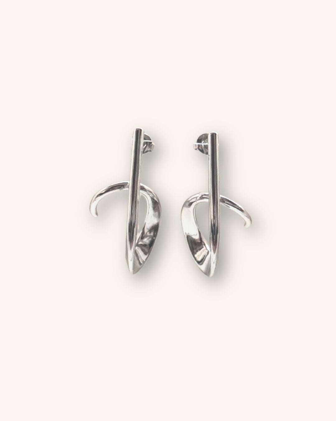 Sculptural σκουλαρίκια από ανοξείδωτο ατσάλι, με καμπύλο, οργανικό σχήμα που θυμίζει ρευστό μέταλλο.