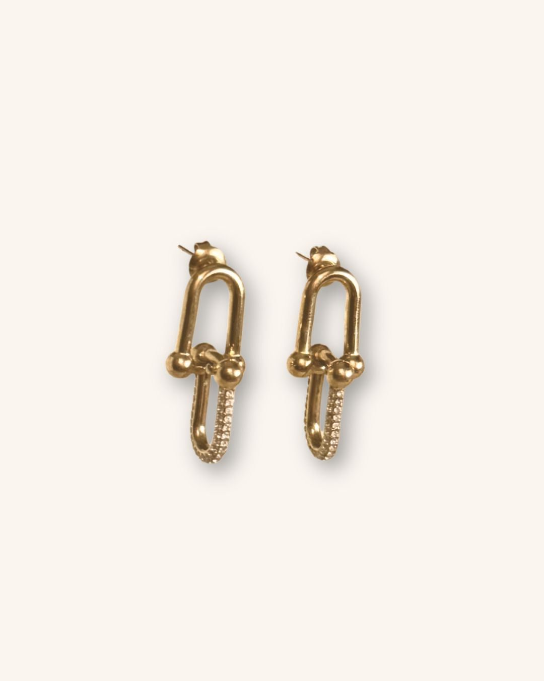 Χρυσοί κρίκοι από ανοξείδωτο ατσάλι, με κάθετο στοιχείο διακοσμημένο με ζιργκόν για μια μοντέρνα, γεωμετρική πινελιά λάμψης.