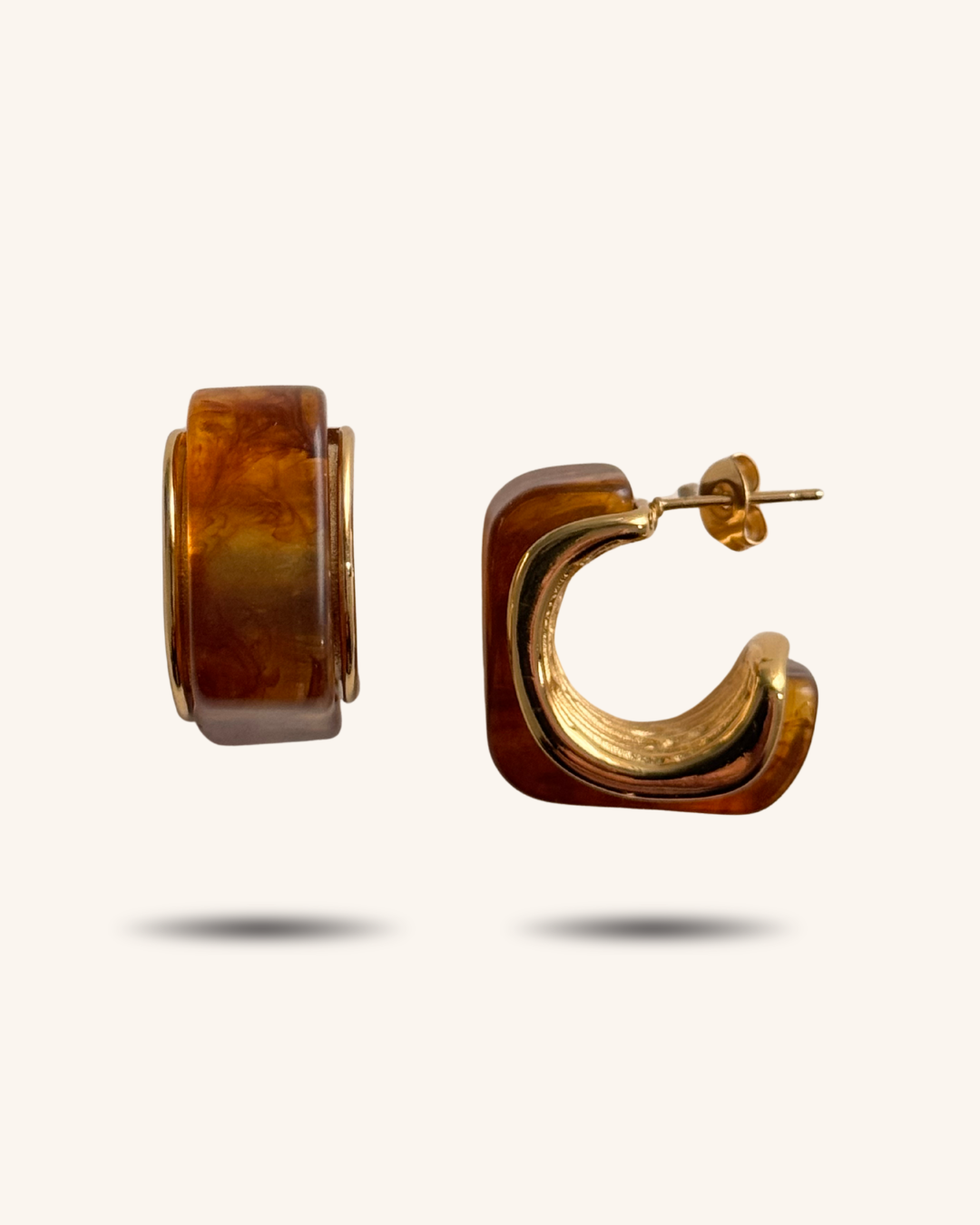 Σκουλαρίκια κρίκοι σε καφέ, marbled τόνους, τοποθετημένα σε χρυσή μεταλλική βάση για vintage-chic αισθητική.
