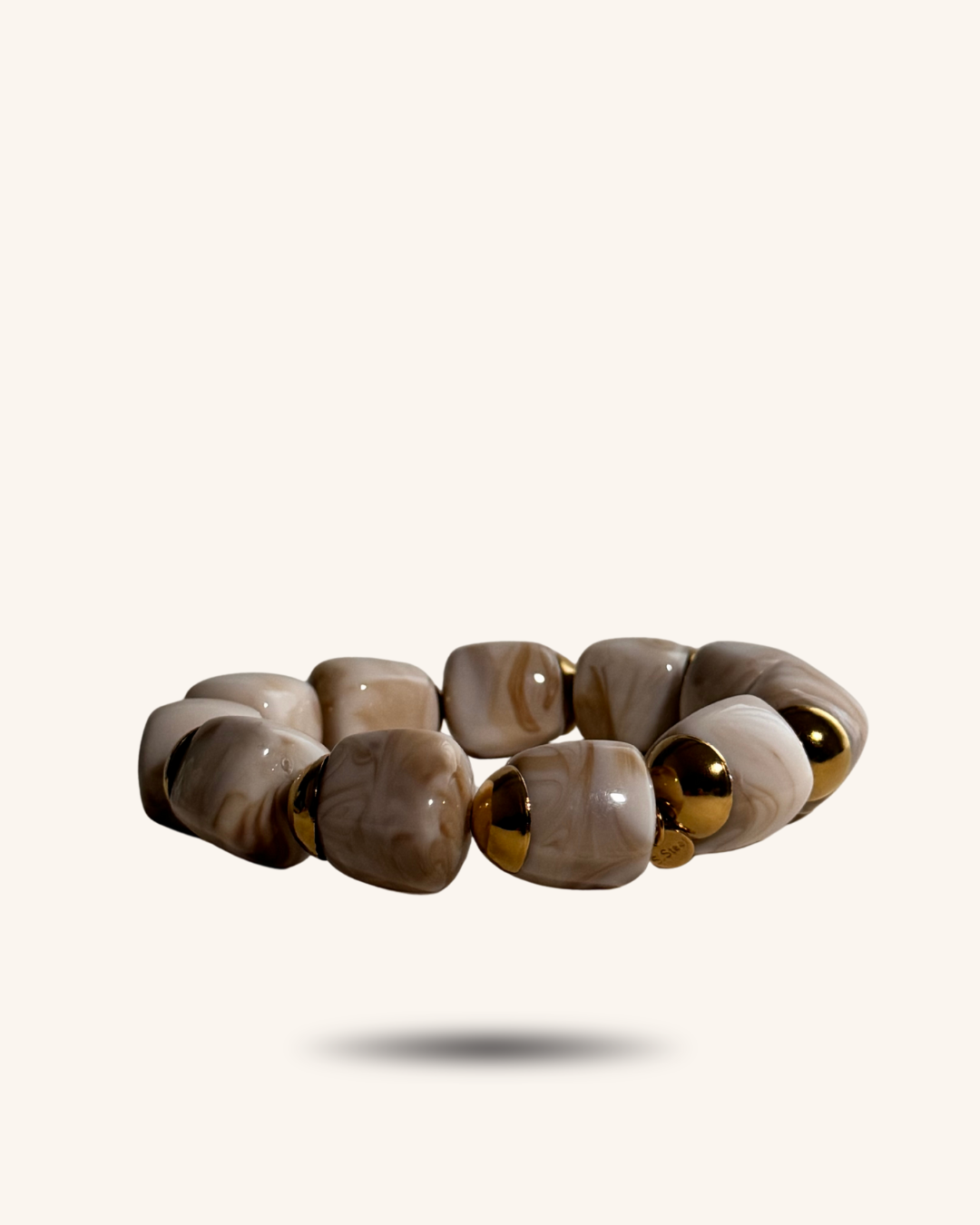 Βραχιόλι σε marbled εκρού–μπεζ τόνους, συνδυασμένες με χρυσές μεταλλικές λεπτομέρειες για ένα κομψό αλλά statement αποτέλεσμα.