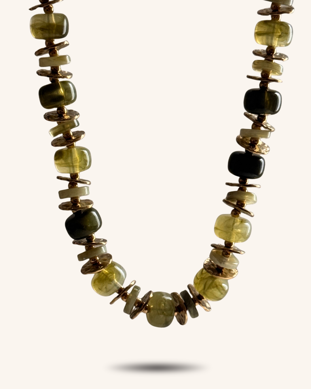 Κολιέ με φυσικές πέτρες αχάτη σε λαδί και γήινες αποχρώσεις, συνδυασμένες με organics ακανόνιστους δίσκους για μια πιο φυσική, boho-lux αισθητική.