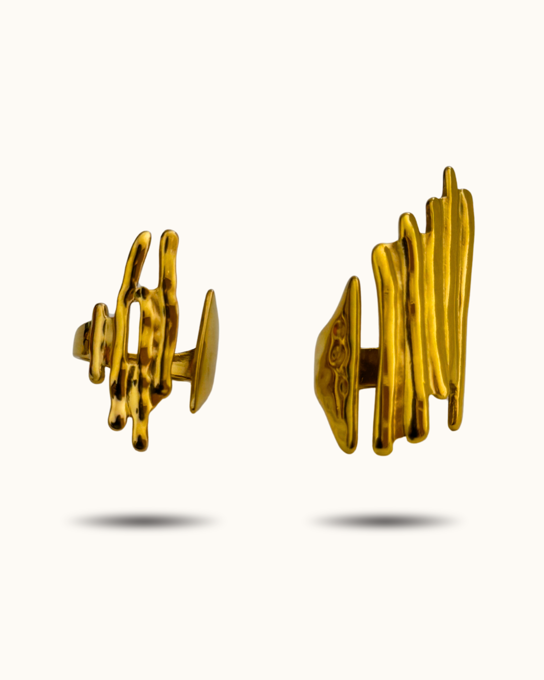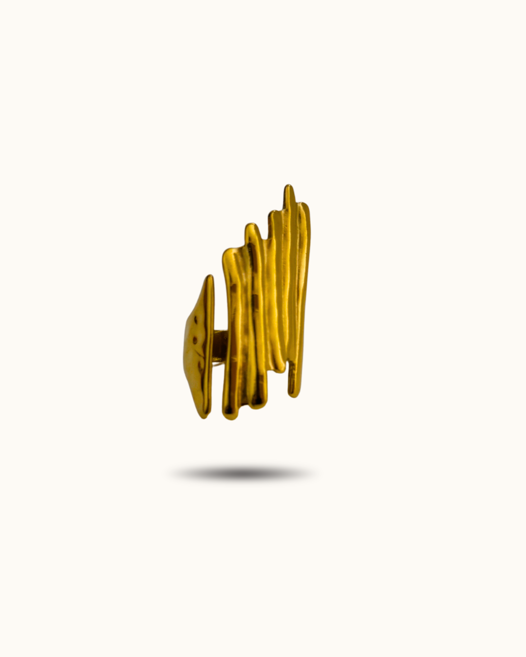 Δαχτυλίδι σε χρυσό τόνο με textured, “γλυπτική” επιφάνεια που θυμίζει φυσικές γραμμές και οργανικά σχήματα. Ένα statement κομμάτι με καλλιτεχνικό χαρακτήρα, που ξεχωρίζει για τη μοντέρνα και bold αισθητική του.